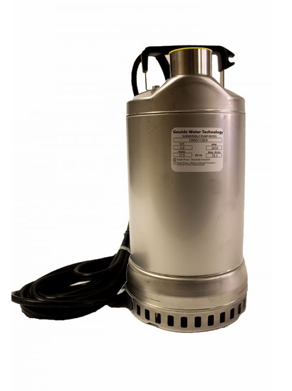 Bomba sumergible marca Goulds con descarga de 1.5″ paso solidos de 3/8″ con motor electrico de 0.5 HP, 3450 RPM, trifasico, 230 volts.